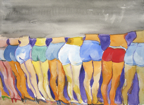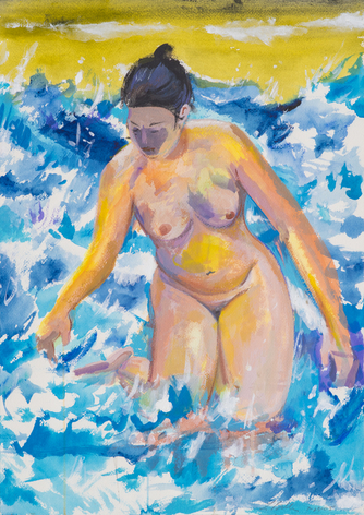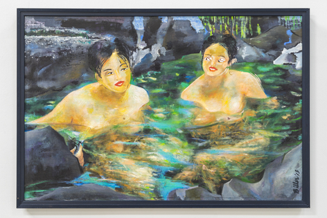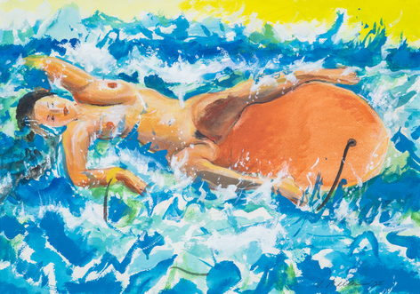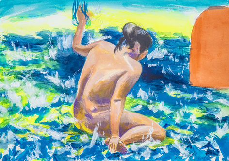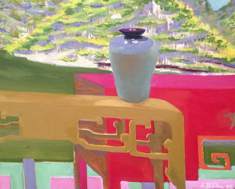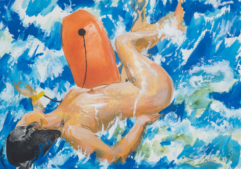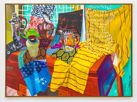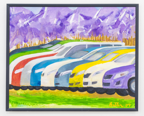 Now, for his first exhibition with Rosamund Felsen Gallery, Biller presents a body of paintings including still lifes, figures, interiors and landscape. In these paintings, lines weave through charming compositions as beautiful objects are celebrated with equally beautiful measure. Choruses of intense, eccentric and vibrant colors sing praises of glistening vases, sensually patterned textiles, and cars resting before the mountainside. Accompanying the paintings of emotive scenes and sensual objects is a series of figure paintings. One set of these portrays the gestural female form languidly luxuriating in luscious tranquil waters, while another displays audacious nudes wrestling with roaring & tumultuous waves.